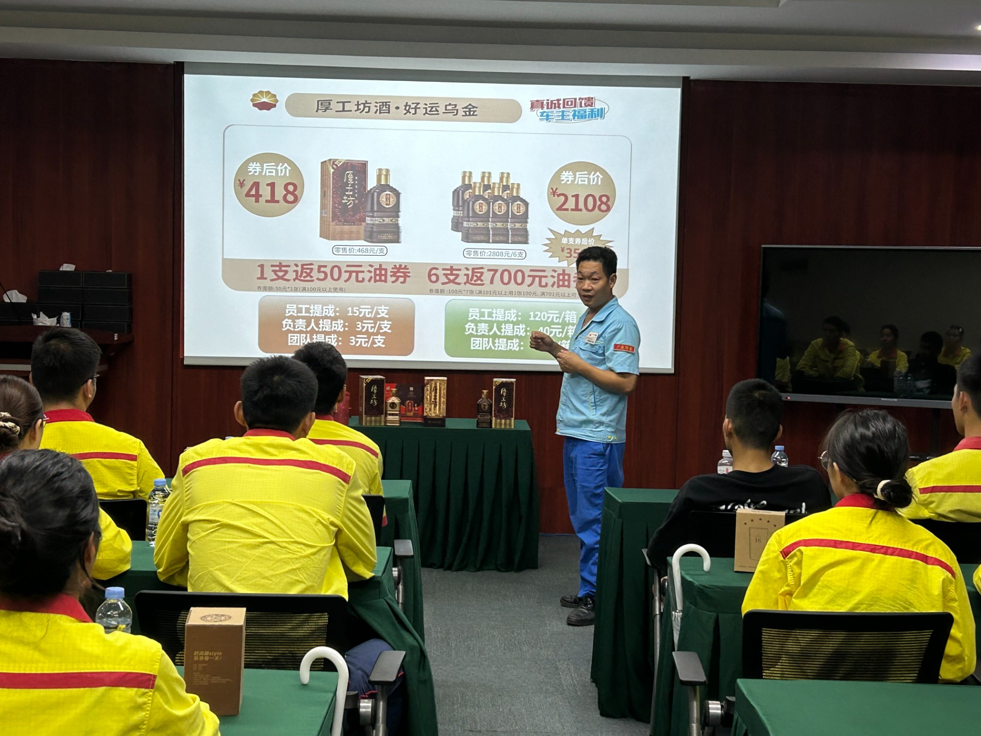 近日,為了調(diào)動(dòng)員工促銷積極性,提升便利店銷量,更好促進(jìn)油非互動(dòng),非油品部新增自營酒類禮包銷售。11月2日,非油品部組織友潤全體員工到友之源會(huì)議室,開展厚工坊酒類產(chǎn)品銷售培訓(xùn)會(huì)。此次共上新三款酒,非油品部胥輝云經(jīng)理對(duì)每一款酒的特點(diǎn)、賣點(diǎn)以及員工促銷提成方面進(jìn)行了逐一宣講。片區(qū)負(fù)責(zé)人侯永平在會(huì)議中講解開展禮包促銷活動(dòng)的原因和開展禮包促銷的方法,提升員工促銷的主動(dòng)性。