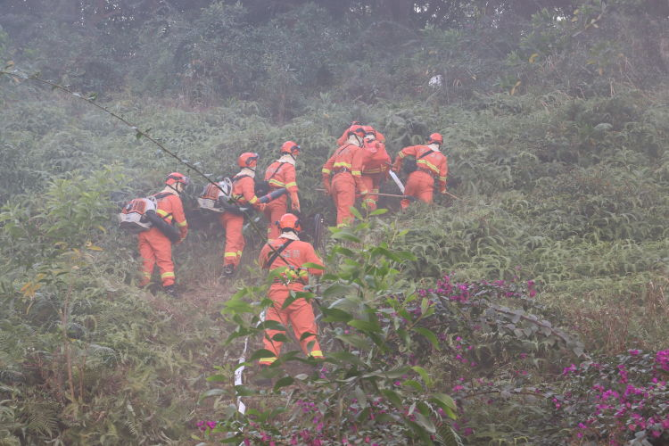 深圳市龍華區(qū)森林消防綜合應(yīng)急救援大隊(duì)駐觀湖街道中隊(duì)隊(duì)員分為三組開展滅火工作,一組隊(duì)員利用水槍連接消防水罐車向起火部位噴水滅火,二組隊(duì)員利用打火耙緊貼火線處置地面火,三組隊(duì)員使用風(fēng)力滅火機(jī)采取多機(jī)編組的方式,利用強(qiáng)風(fēng)壓制林火發(fā)展。
