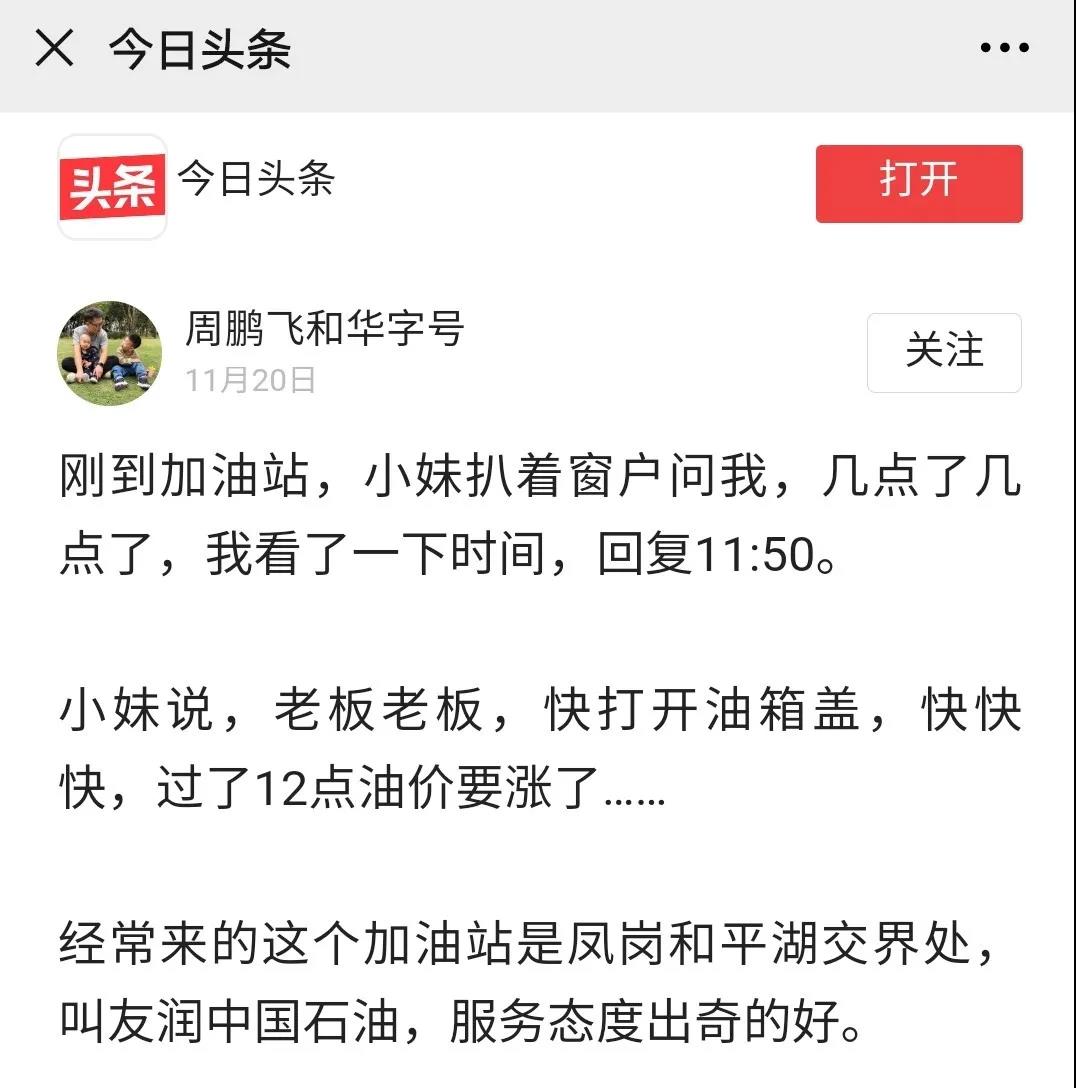 11月20日凌晨,有位顧客在《今日頭條》上分享了自己在中國(guó)石油友潤(rùn)加油站的消費(fèi)體驗(yàn),加油員熱情周到的服務(wù)以及維護(hù)顧客利益的舉動(dòng)贏得顧客的稱贊。